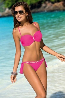 Раздельный купальник чашка бандо c Пуш-Ап вставляется и вынимается, завязки как у бюстгальтера с замком сзади и с регулировками на плечах и с двойной вертикальной поддержкой по бокам. Завязки снимаются с переди. Плавки на завязках. Состав : 80% полиамид+20% эластан. Сделано в Польше.