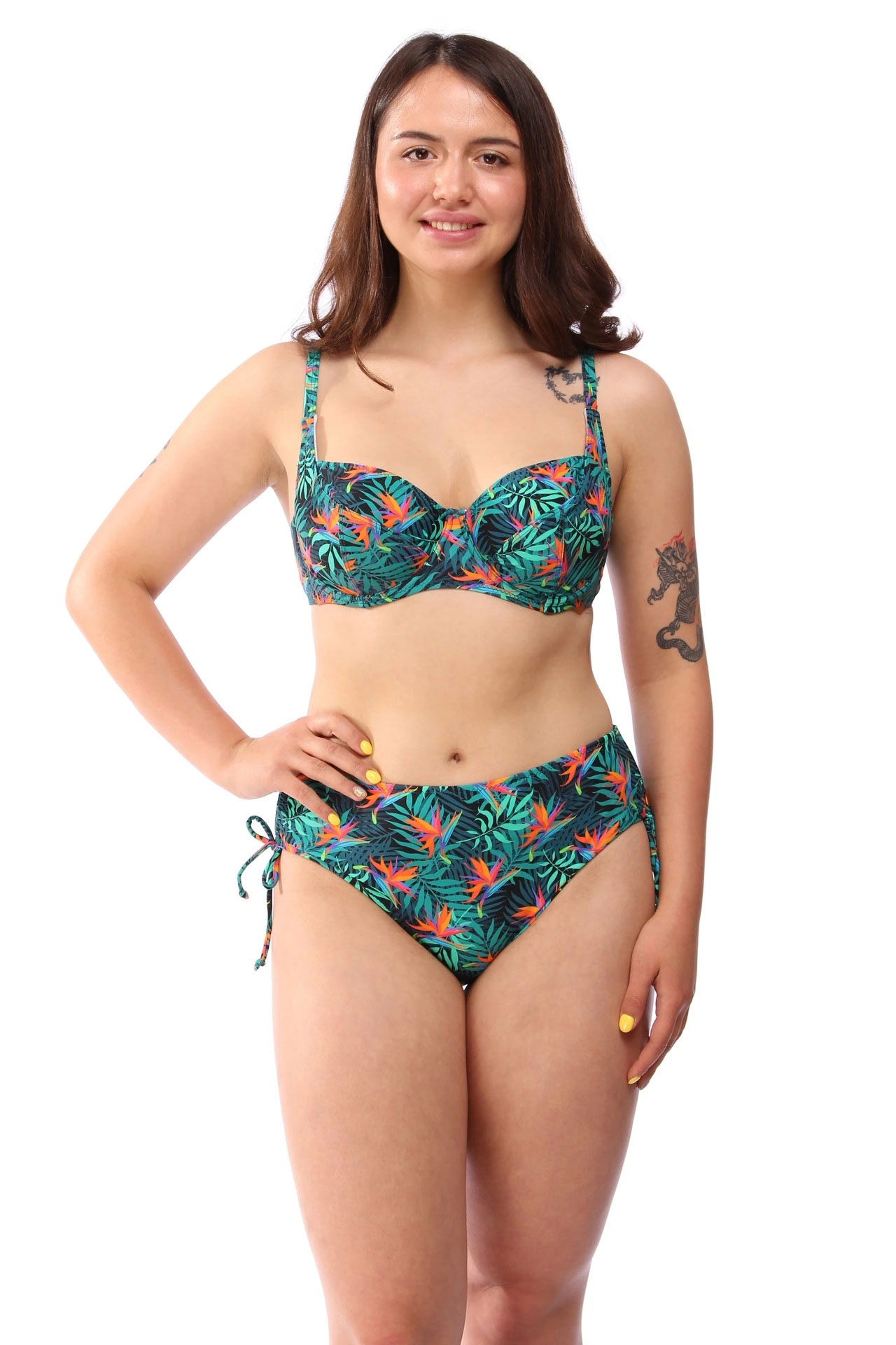 Купальник раздельный с лифом в виде тонкой чашки на кости и боковой костью, металлическая застежка на спине, бретели регулируются на плечо, плавки классические регулируются по высоте по боковым швам.