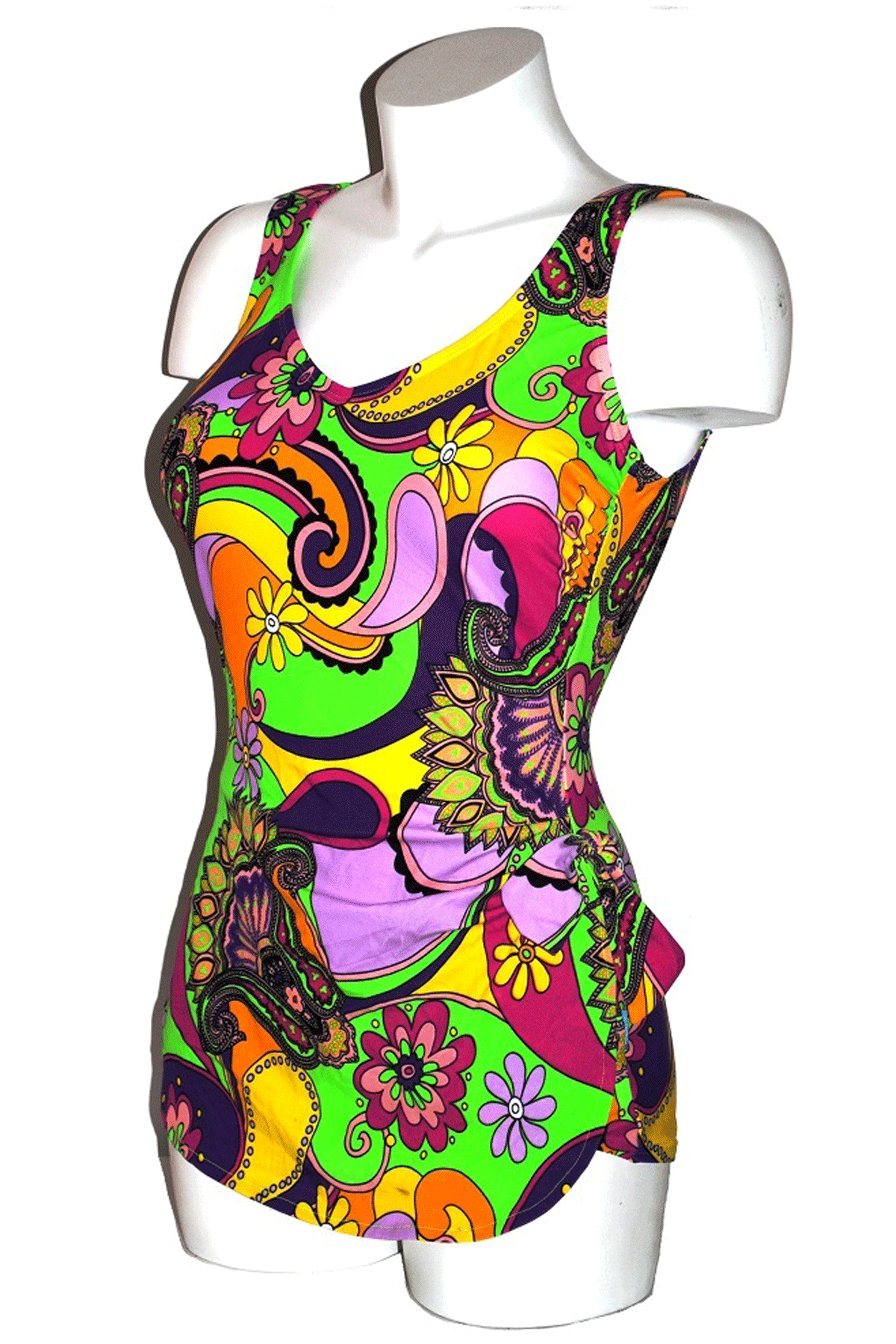 Классический слитный купальник от российского производителя выполнен из ткани с ярким цветочным принтом. Спереди драпировка в виде небольшой юбочки, скрывает недостатки фигуры и визуально стройнит. Скрытый топик с вшитыми поролоновыми чашечками и широкие лямки обеспечивают надежную поддержку для груди. Вырез бедра занижен. Купальник рекомендуется для женщин с пышными формами. Идеально подойдет как для тренировок в бассейне, так и для пляжного отдыха. Состав ткани: 20% эластана и 80%полиамида. Размерный ряд соответствует российскому стандарту.